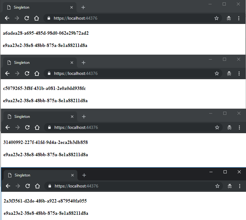 Repare que temos dois comportamentos aí. O primeiro Guid é o Comum, que cria uma nova instância a cada vez que é chamado. O segundo é o Singleton, este cria somente uma instância e a utiliza para o projeto todo. Não importa quantas vezes chamamos a página, o Singleton não vai mudar e, se mudar, mudará para todo o sistema.