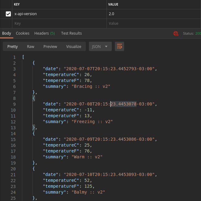 Agora, quando colocamos o atributo x-api-version com o valor 2.0 no Header da requisição o método chamado é o GetV2.