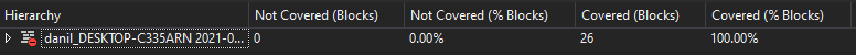 Executando o Code Coverage do Visual Studio podemos ver que todos os casos foram cobertos e validados por testes.